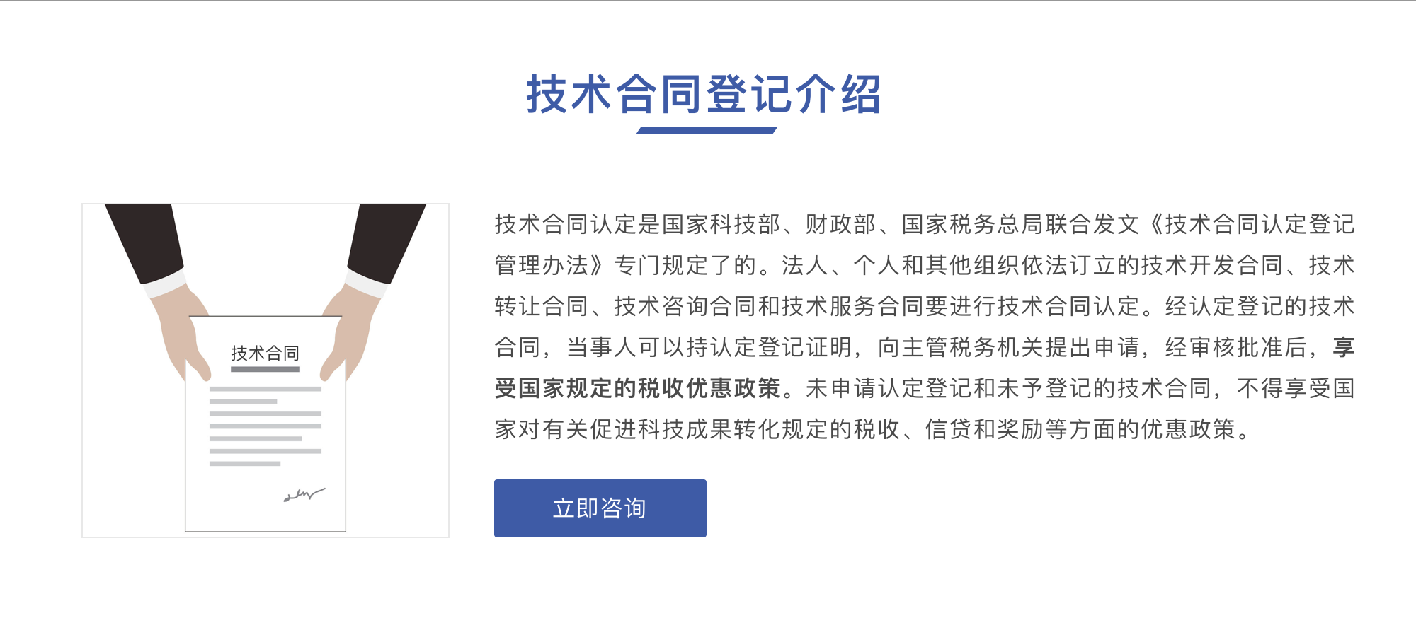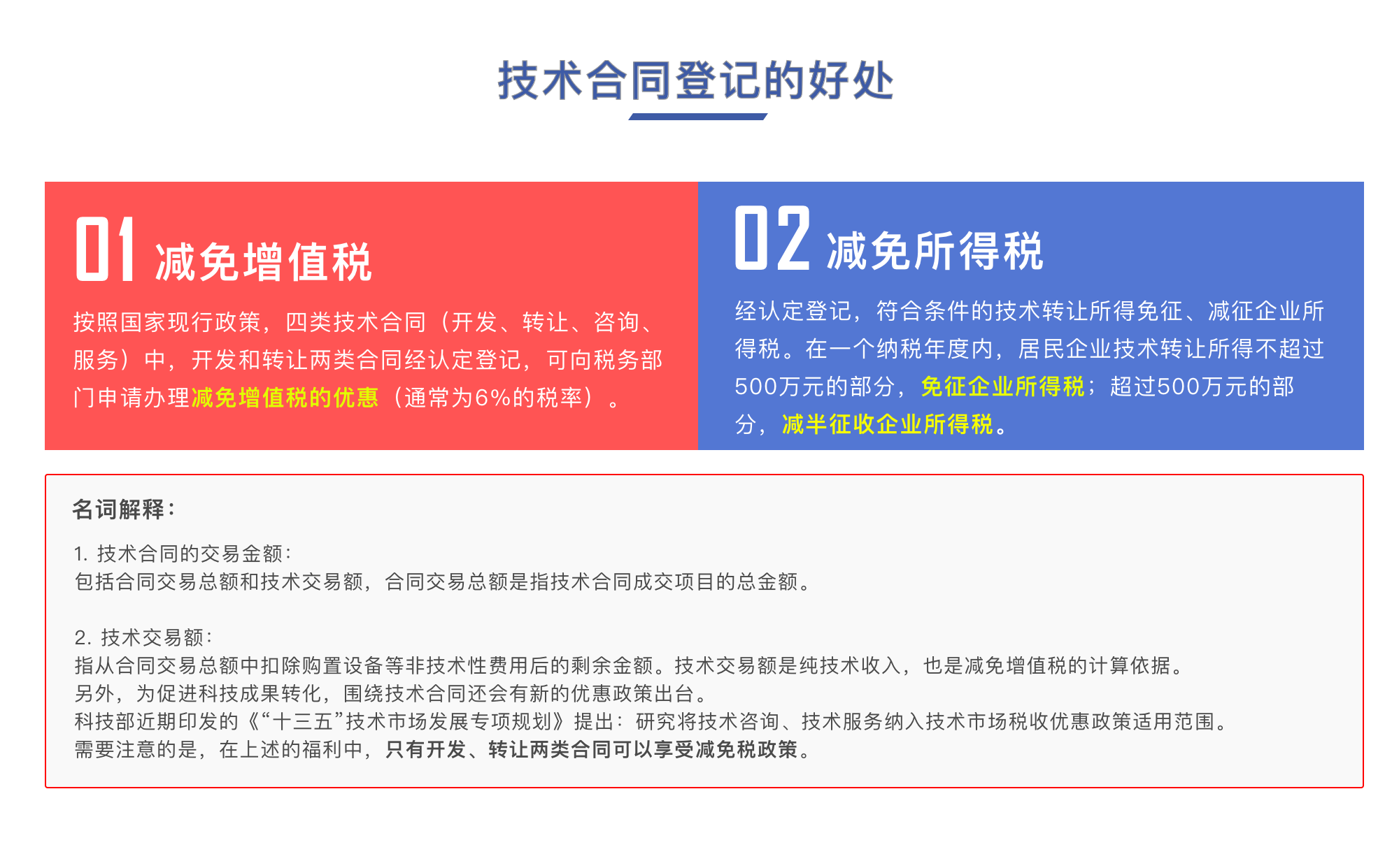 | 答:技術(shù)交易機構(gòu)備案是看你單位是否具備從事技術(shù)交易的資質(zhì)。技術(shù)合同認(rèn)定登記是特指某一份合同屬于技術(shù)合同的哪一類。因此、要想享受國家科技部、國家稅務(wù)總局的優(yōu)惠政策必須先備案,后進行技術(shù)合同認(rèn)定登記。 | |||